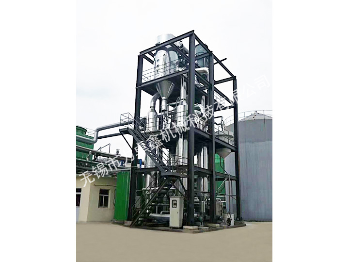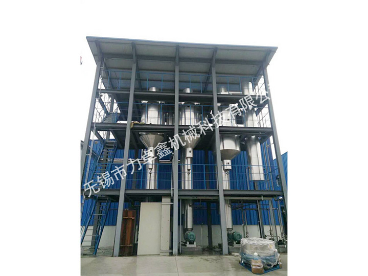 工作原理:四效降膜蒸發(fā)器需濃縮的料液由泵送入加熱管頂部,沿著加熱管內(nèi)壁形成液膜向下流動(dòng)。在這個(gè)過程中,由于管外的加熱,管內(nèi)液膜開始沸騰并部分蒸發(fā)